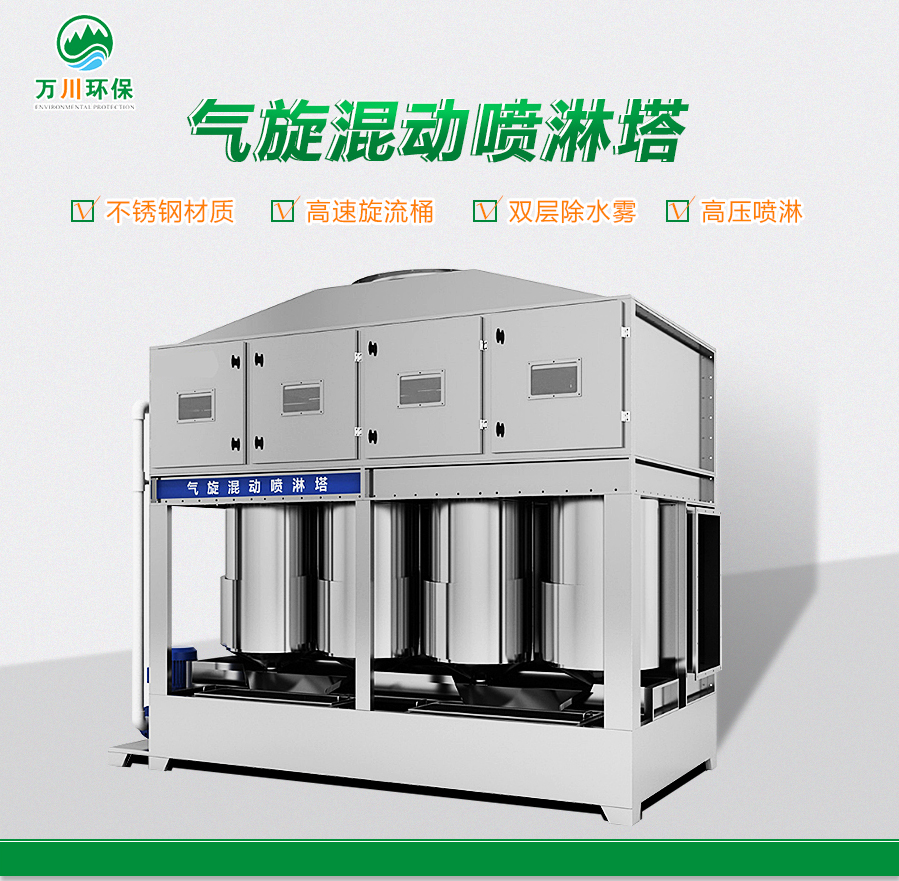 雙級氣旋噴淋塔利用氣體與液體之間的接觸進行氣液分離。氣體中的污染物傳送到液體中,與液體充分接觸洗滌,它能有效分離氣體中含塵含味物質,降低氣體溫度,凈化污染氣體,達到清凈空氣的目的。